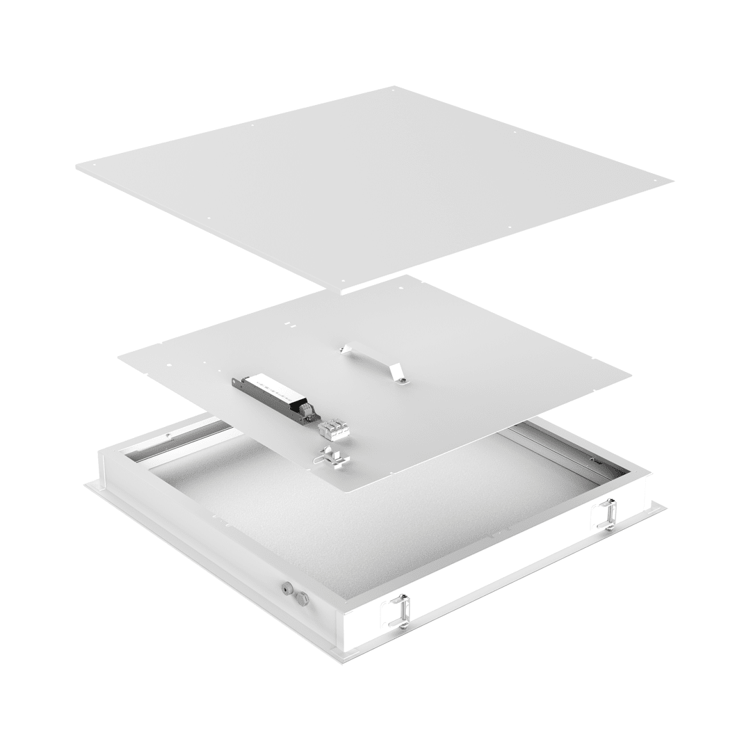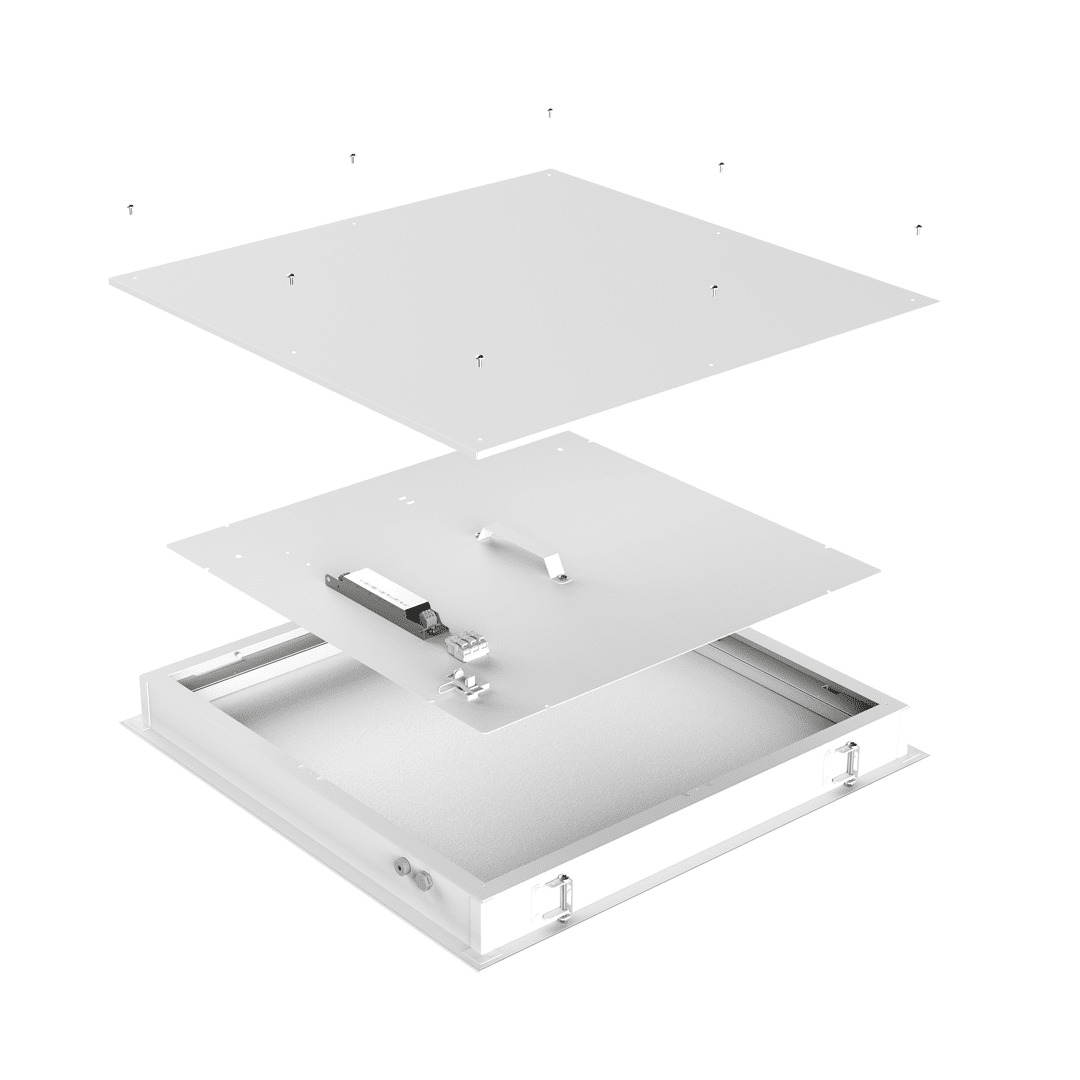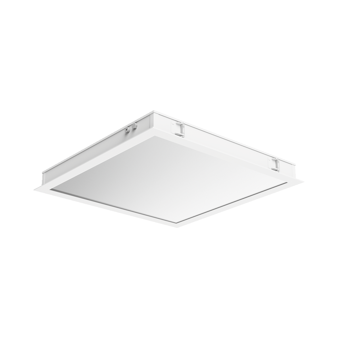 La face avant du luminaire est en aluminium et en verre trempé de 4 mm d'épaisseur, résistant aux chocs (classe IK09) et aux produits chimiques. Le système de caches modulaires (Glass / Opal / PRM) permet de choisir les caractéristiques optiques appropriées en fonction des exigences de l'application, depuis un éclairage uniforme et diffus jusqu'à un éclairage directionnel précis. La version SW R est destinée à être montée dans des plafonds renforcés.